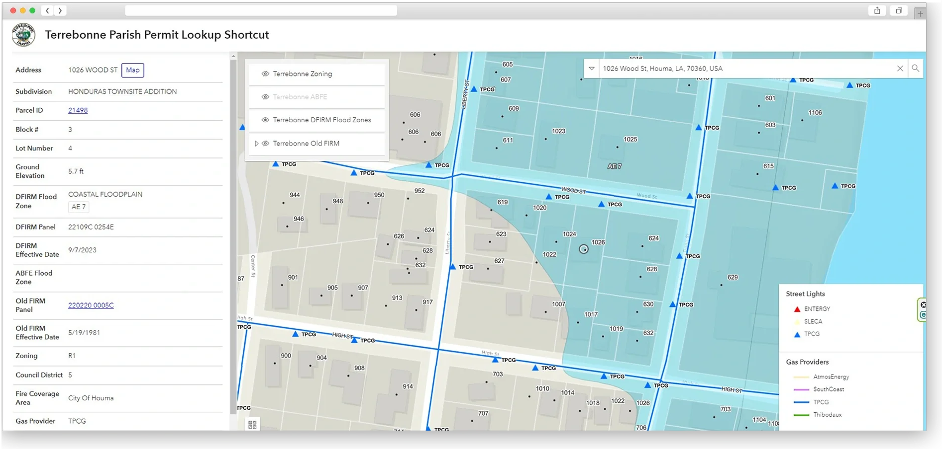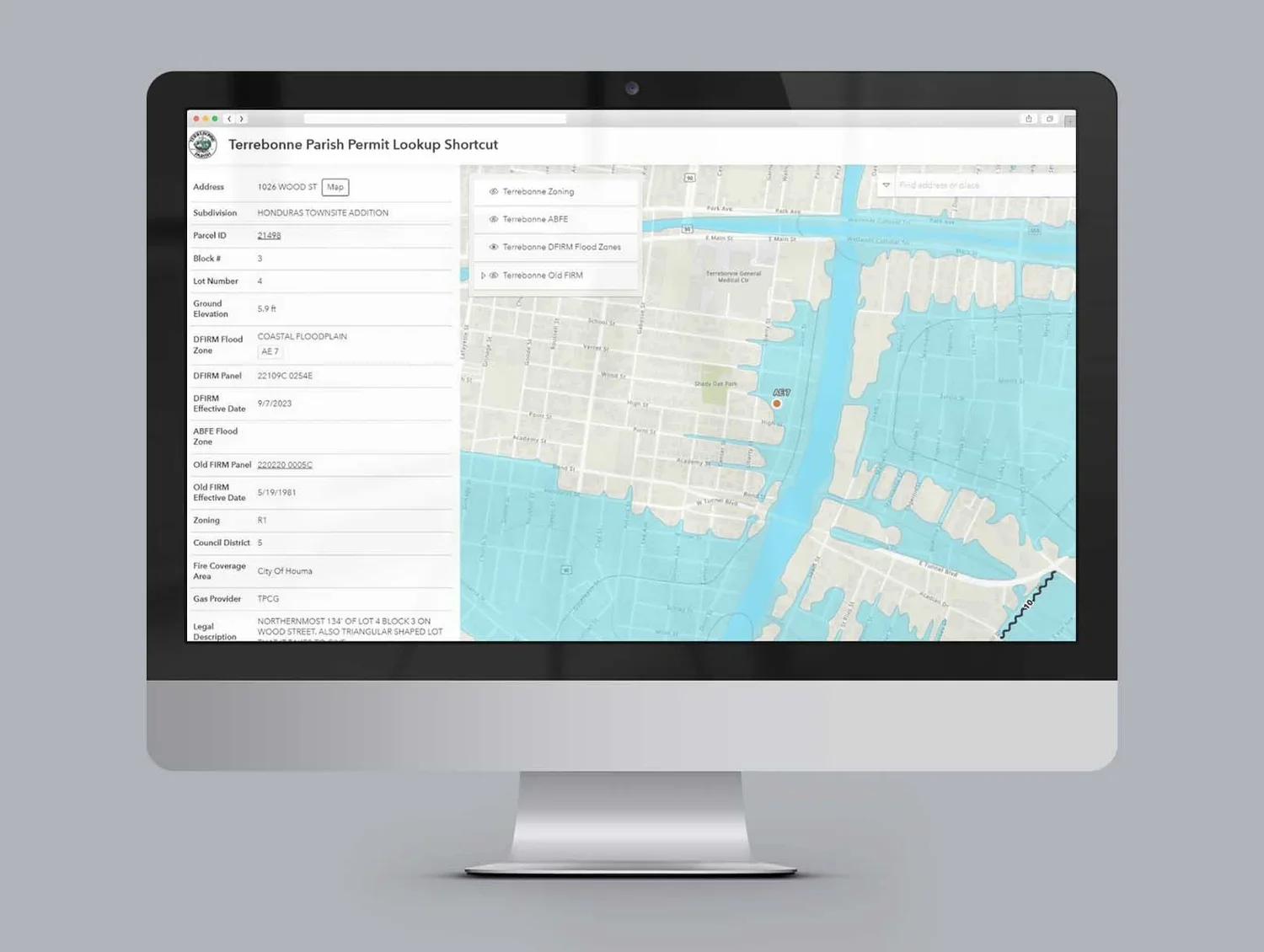 The Terrebonne Parish Permit Lookup Tool, developed and maintained by Desire Line, reduces permit issuance time by approximately 30 minutes per permit by aggregating real-time data across multiple platforms, streamlining permit clerk workflows, and accounting for frequent service interruptions from calls and walk-ins. This accelerated delivery was enabled by an innovative, in-house Permit Support Tool that Terrebonne Parish continues to use to significantly reduce permit processing times. Desire Line provides limited technical assistance to support efficient daily permit operations and to help ensure FEMA National Flood Insurance Program (NFIP) compliance for more than 800 substantially damaged properties.