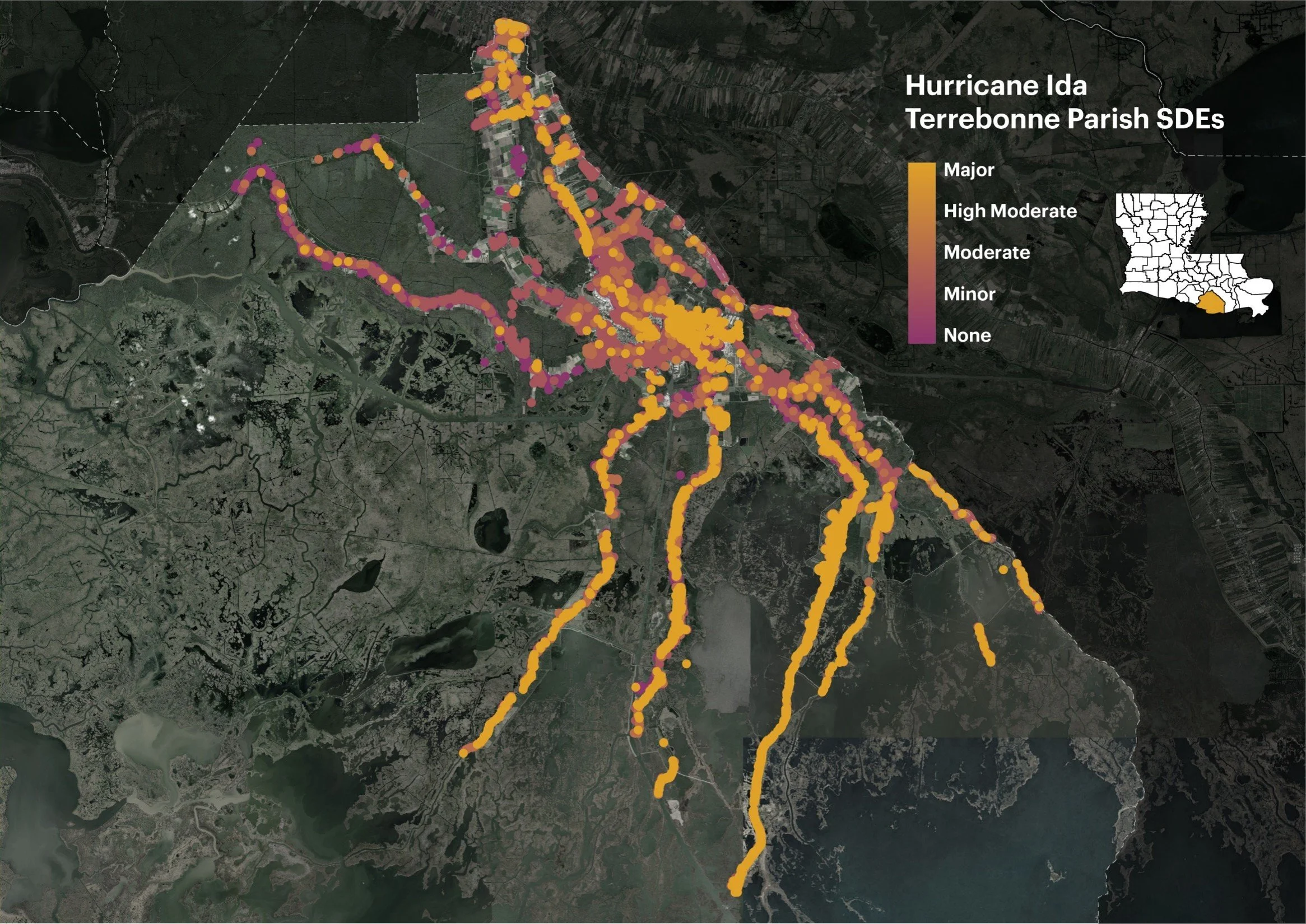 Desire Line completed more than 35,000 FEMA Substantial Damage Estimates (SDEs) in close coordination with the Terrebonne Parish Planning Department, meeting and exceeding minimum FEMA National Flood Insurance Program (NFIP) requirements following Hurricane Ida (2021).