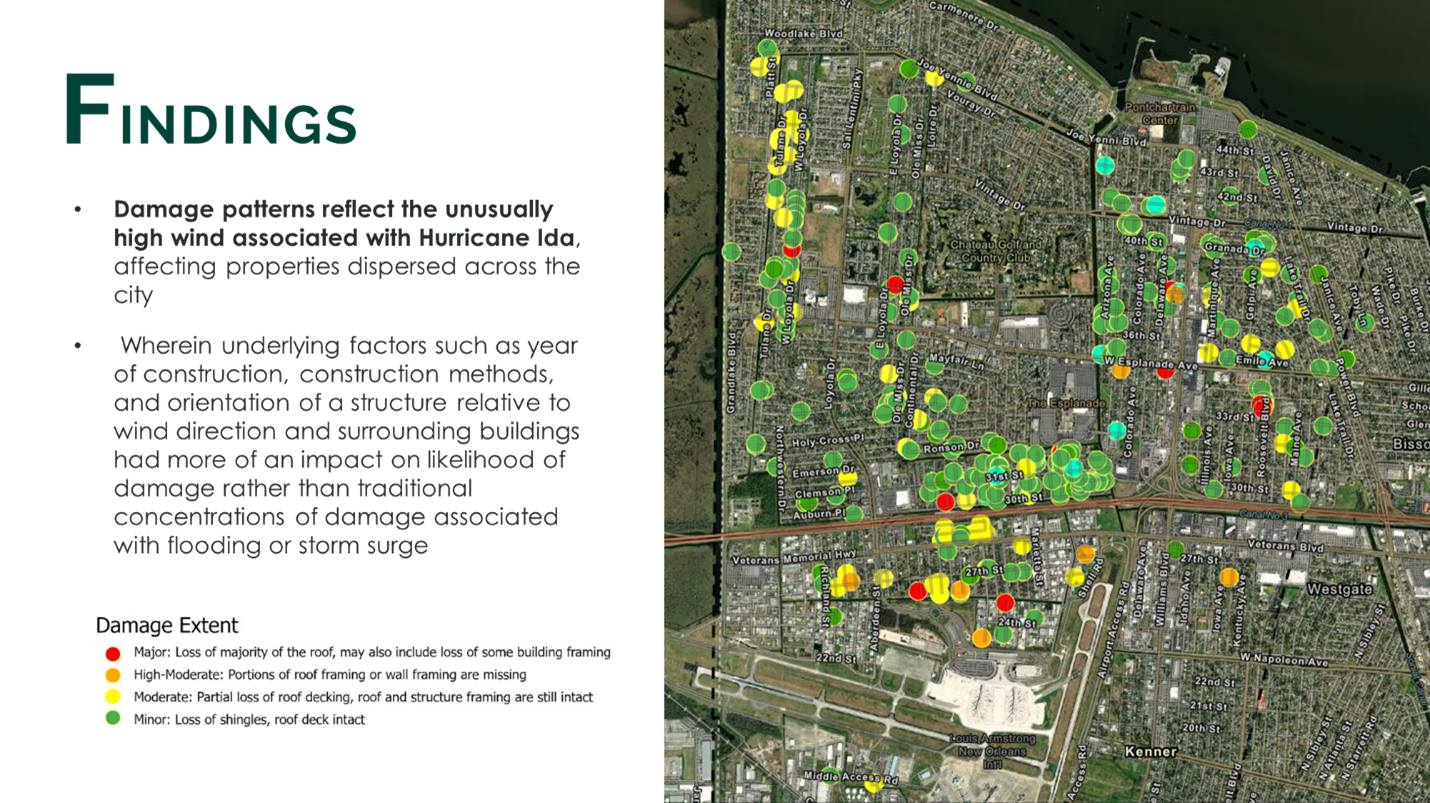 In response to Hurricane Ida (2021), Desire Line completed a comprehensive review and re-inspection of FEMA substantial damage determinations in coordination with the City of Kenner Inspection and Code Enforcement Department, in fulfillment of minimum FEMA NFIP requirements, as well as documented recommended recovery programs, unmet needs, and potential sources of grant funding to support long-term recovery efforts. Desire Line completed field work for this project within one month including production of a fully interactive GIS map showing damage information on each property inspected, full damage assessment reports for each property, a report showing total damage analysis, an unmet needs assessment for the City, and coordination with FEMA to ensure that all data was transferred to federal and state agencies in accordance with NFIP and state protocols.